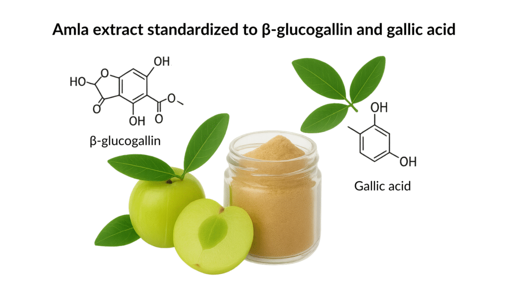 Amla extract, commonly known as Indian gooseberry, is considered one of the best rejuvenating herbs in Ayurvedic tradition. Traditionally, ascorbic acid has been used as the standard biomarker for amla extract in dietary supplements. However, recent research has shown that amla contains inconsistent levels of ascorbic acid, sometimes only in trace amounts. We use an authenticated Amla extract standardized with β-glucogallin—a potent antioxidant shown to be more effective than ascorbic acid.